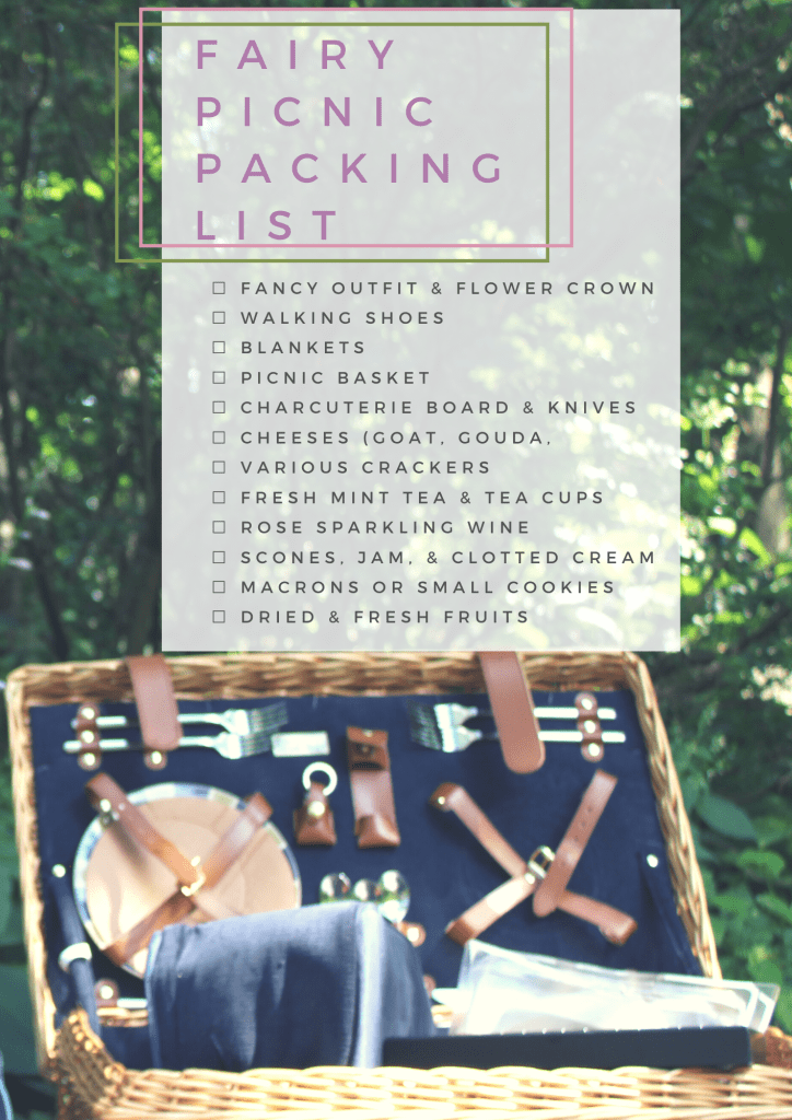 Now what everyone needs! A packing list so you don’t forget what to take on your fairy picnic packing list.
